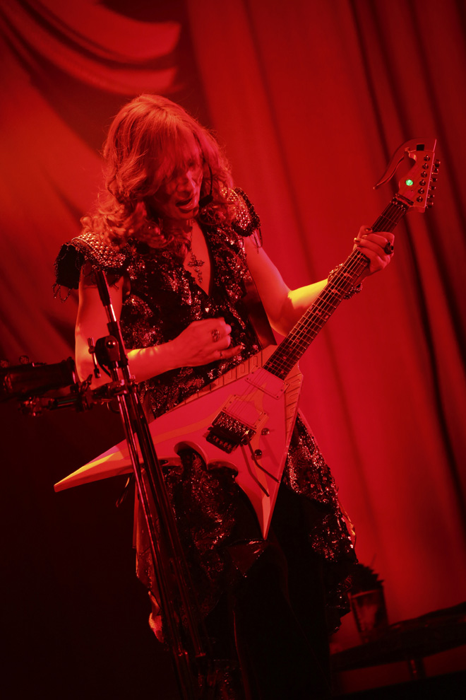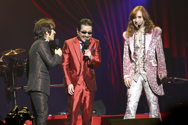 3人全員が還暦を迎えて初めてのライブとなったこの日は、ちゃんちゃんこよろしくステージは真っ赤にセットされ、桜井賢も全身の真っ赤のスーツで登場してきた。ベースを持たずまさかのハンドマイクでステージのセンターから登場、坂崎がベースを抱え高見沢と2人で桜井をセンターに迎える形だ。