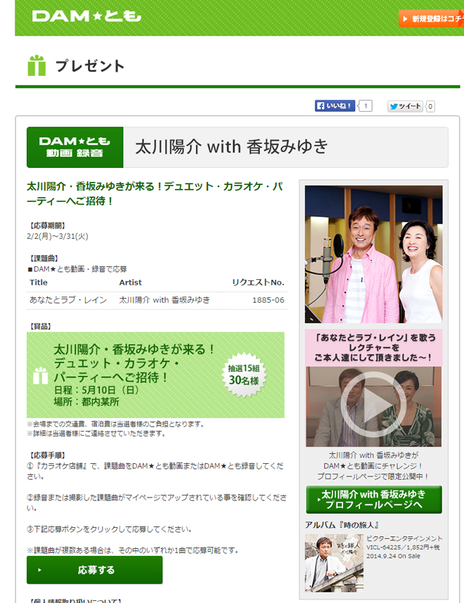 DAM★ともでは、太川陽介と香坂みゆきが来るデュエット・カラオケ・パーティーへの招待企画を実施中だ。