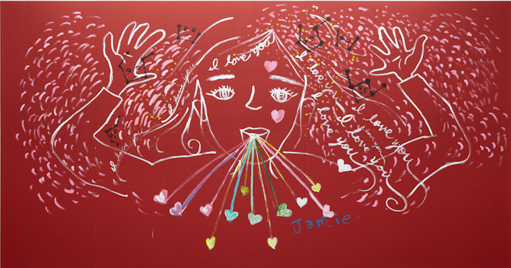 大宮エリーは、1975年大阪生まれ。映画を撮ったり、舞台の作演出をしたり、活動はジャンルレス。2012年からは、来場者が参加して作品が完成するという特徴を持つ、体験型の個展をはじめる。「立ちはだかるドア」「心の箱」「言えなかったメッセージボトル」など8つの作品で構成された、「思いを伝えるということ展」(2012~13)開催。2013年は、「赤い道」「黄色い道」「砂漠の道」などの道を歩いてもらうことで、生きるとは何かをそれぞれがそれぞれに問いかける個展「生きているということ展」(2013)を発表。また、歩くプラネタリウムという設定で、星をかきわけたり天の川に飛び込んだりする「星空からのメッセージ展」(2013~14)を発表。絵画制作は、2012年に上野にてライブドローイングした作品「お祝いの調べ:直島」がきっかけとなって始まり、いまも続行している。