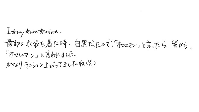 最初に衣装を着た時、白黒だったので「オセロマン」と言ったら、皆から「オセロマン」と言われました。