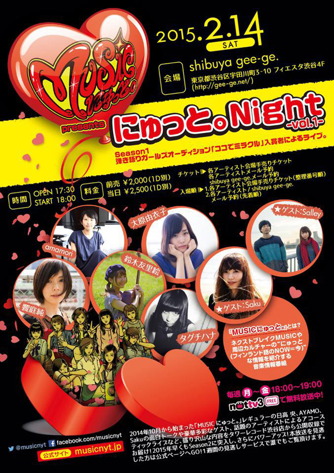 生ライブイベント<にゅっと。Night -vol.1->の出演者は、Season1の際に行なわれた弾き語りガールズオーディション「ココでミラクル」にて、グランプリを受賞したタグチハナ、審査員特別賞のamamor、饗庭純、大原由衣子、鈴木友里絵が出演、ゲストには番組MCも務めるsaku、Salleyが登場する予定だ。