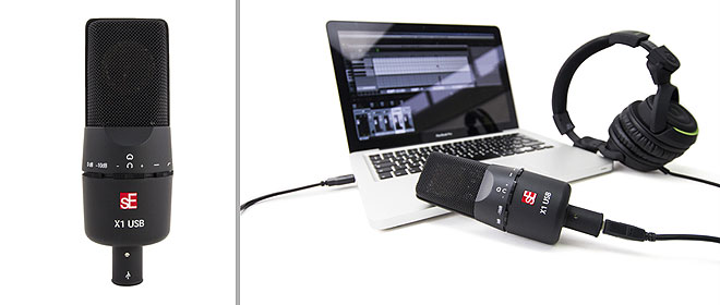 SE X1同様にラージダイアフラムを採用したコンピューターに直結できるUSBマイク。最大で24ビット/192kHzでの録音が可能。ヘッドフォンアンプも内蔵。カーディオイド指向性。USBケーブル、マイクホルダーが付属。