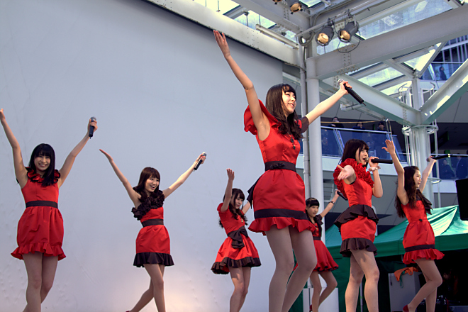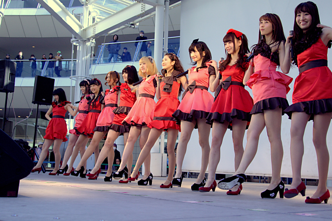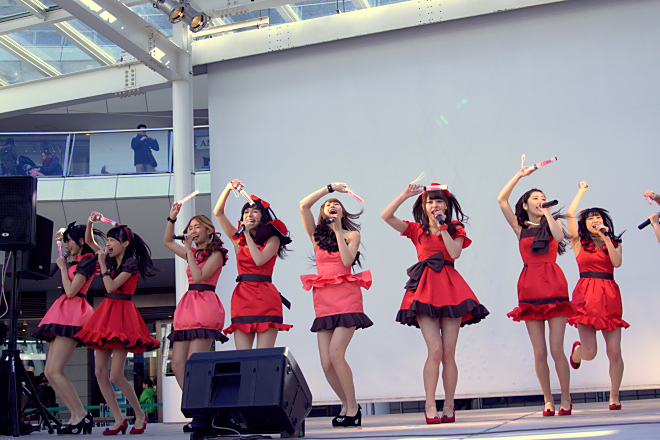 続いてDoll☆Elementsによる「君に桜ヒラリと舞う」、NEO from アイドリング!!!の「キミといたナツ」がそれぞれ立て続けに披露されたあと、ステージ上にピンクのペンライトを持ったメンバーが勢揃いし、Doll☆Elementsの楽曲「with you… 」をコラボでパフォーマンスして会場を盛り上げる。ラゾーナ川崎プラザの広場全体からあつまる注目に、グループの垣根を超えて喜びを分かち合うメンバー達の姿はコラボユニットならではの貴重な光景だ。最後はもう一度「ショコラ☆ロマンティック」を披露し、全員でのラインダンスとスイートな笑顔で観客を魅了した。