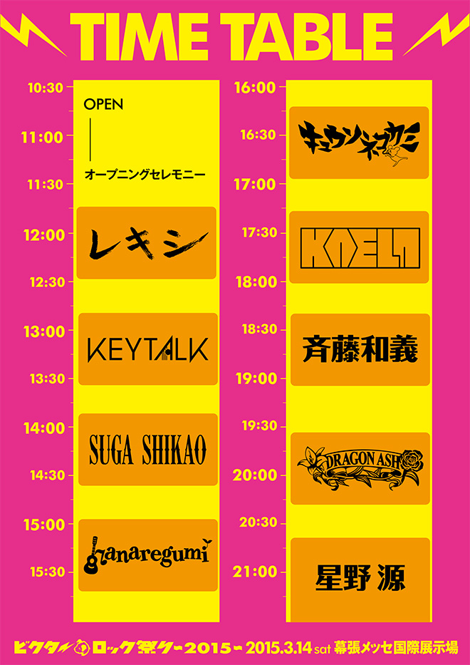 3月14日開催<ビクターロック祭り2015>のタイムテーブルが発表となった。