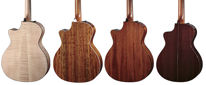 ▲異なる材を使用した各モデルのバック。左から314ce、414ce、GAce-Mahogany、NS72ce。