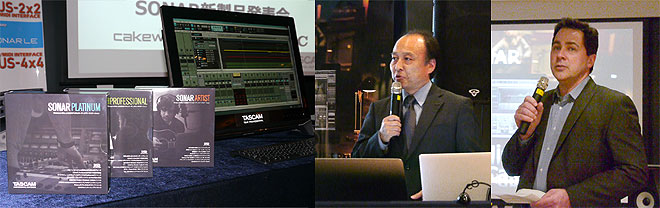 ▲名称も新たに3グレードをラインナップしたSONAR新シリーズ(左)。ティアックの執行役員兼ミュージックインダストリービジネスユニット長の吉野伸也氏は「Cakewalk社とティアックの技術が融合した記念すべき初のコラボ商品」と紹介(中)。Cakewalkからは代表取締役のMichael Hoover氏が来日。
