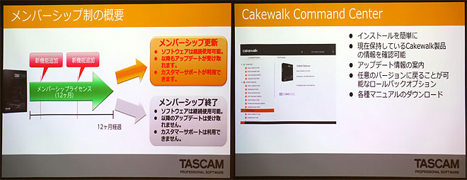 もう1つ重要なこととして紹介されたのが、新たに構築されたCakewalk Command Centerというシステム。シリアルナンバーやライセンスを一元管理でき、ユーザーのソフトウェアがどのような状態になっているか、新たにインストールできるソフトウェアがあるか、などが常にわかるようになっている。