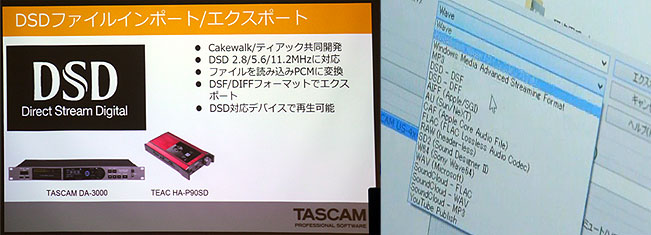 新機能最大の目玉はDSDフォーマットへの対応。ハイレゾ音源の配信で注目を集めているDSDファイルのインポート、エクスポートが行える。これはDSDレコーダーを長く手がけてきたTASCAM開発陣の協力により実現したもので、ギブソン・ブランド・ファミリーのCakewalkとTASCAM初のコラボによる成果だ。DSDファイルをPCM変換して編集し、DSDファイルとして書き出すことになるが、音質変化は最小限に抑えられている。実際にインポート、エクスポートの手順を見ることができたが、ファイルのドラッグ&ドロップでインポートできるなどその作業はWAVファイルのインポート/エクスポートと変わらずいたってカンタン。時間もさほどかからない印象だ。