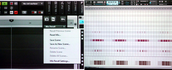 ▲シーンを保存し、エフェクトやインストゥルメントのパラメータも含め瞬時に再現することで試聴比較ができるMix Recall機能(左)。パターツール(右)はマウスで描くように貼り付けが可能。