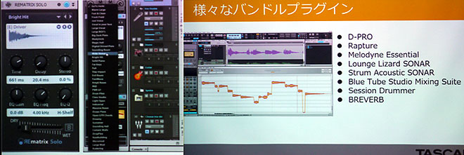 このほかにも多くの新機能を備えた新SONARシリーズ。バンドルプラグインもD-PROやRaptureといったソフトウェア音源、ピッチ/タイミング補正のMelodyne Essentialをはじめ引き続き豊富に揃う。バーチャルインストゥルメントとエフェクトはPLATINUMがそれぞれ21種、60種、PROFESSIONALが17種、44種、ARTISTが11種、19種を用意する。