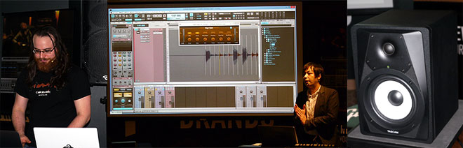 ▲新機能を紹介したのはCakewalkのプロダクト・スペシャリストDan Gonzalez氏(左)。内蔵されるパターンやアルペジエイターを使い、カンタンにトラック制作が行えるデモも実演。新エフェクトのサウンドも聴くことができた(中)。写真右は同時発表されたTASCAMのスタジオモニタースピーカー「VL-S5」。デモでは出荷開始されたばかりのオーディオインターフェイスUS-16×08とともに使用された。