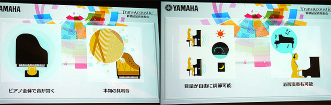 トランスデューサー本体を響板に直接取り付けないヤマハ独自の機構により、アコースティックピアノとしても、響板の自由な振動を損なうことなく演奏できるのもポイント。アコースティックピアノの響板を電子音にも利用することで、ヘッドホンを装着しなくても適切な音量でのピアノ演奏が可能。昼はアコースティックピアノの音で、夕方以降は音量をしぼって、深夜ならヘッドホンに切り替えてといった使い方ができる。音量を調節したときも、響板の振動や弦の共鳴効果によりピアノ全体から豊かで自然な音が広がるという音質的な利点のほか、ヘッドホンが苦手な子供でも安心というメリットもある。