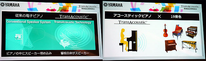 「トランスアコースティックピアノ」は、アコースティックピアノとしての音色や楽しみ方はそのままに、現代のテクノロジーを融合させたハイブリッドピアノ。音量が自由に調節できることから、これまで周囲への音の問題でアコースティックピアノを選ぶことができなかった人達に向けた新たな選択肢となるモデルだ。その特徴は、スピーカーをまったく内蔵せず、響板を電子音の演奏時にも利用したことにある。「トランスアコースティック=TransAcoustic」は、「trans」(英語の接頭辞“~の向こう側に”)とアコースティックピアノの「Acoustic」を組み合わせた造語で、これまでの枠を超える新しいピアノのあり方を表している。