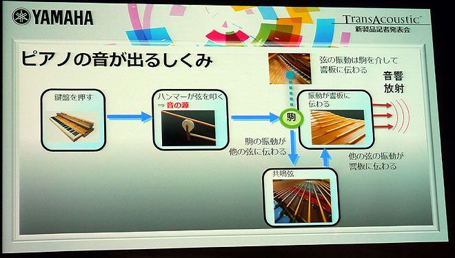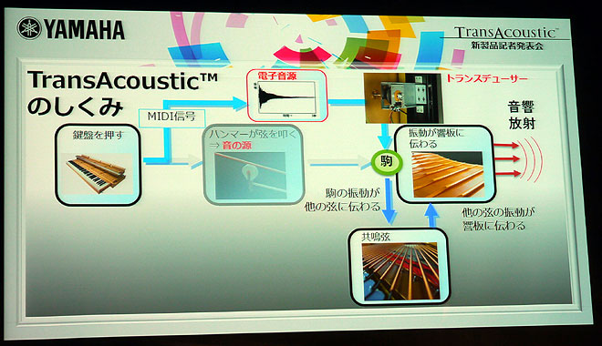 ▲一方、TransAcousticでは、ハンマーが弦を叩く代わりにMIDI信号により内蔵音源へ、さらにトランスデューサーを介して、駒や共鳴弦、響板に伝わることで、音量の調節と、ピアノならではの響板の音が鳴る。複雑な共鳴系がそのまま維持されることで、単なるスピーカーではなく、アコースティックピアノが持つ「響き・拡がり」が実現できるのだ。