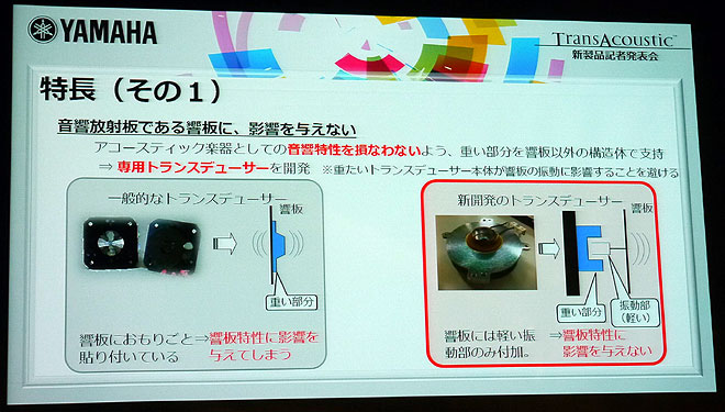 ▲一般的にトランスデューサーは響板におもりごと貼り付いているが、TransAcousticでは、音響放射板である響板に影響を与えないよう、トランスデューサーの重い部分を響板以外の構造体で支持、軽い振動部だけが響板に直接触れている。トランスデューサー自体も専用のものを開発。このほか、環境変化による部材の変化に追従できる連結構造、個体ごとの音響特性のばらつきを補正するシステムも開発された。