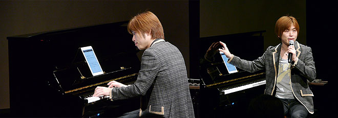 2月24日にヤマハ銀座スタジオで行われた発表会では、トランスアコースティックピアノのしくみや構造が紹介されたほか、THE ALFEEのサポートをはじめ、ピアノ、キーボード、作曲など多方面で活躍するアーティスト、ただすけさんが演奏を披露。アコースティックピアノ本来の音に加え、夜間でも近隣を心配しなくてもいい音量での演奏や、iPadを接続してのアンサンブル演奏、レイヤーモードを使った多彩なサウンドを聴かせた。また、スマートフォンを接続してのオーディオ機器としての再生も実演され、楽器が弾けない人でもスピーカー代わりに使うメリットが示された。