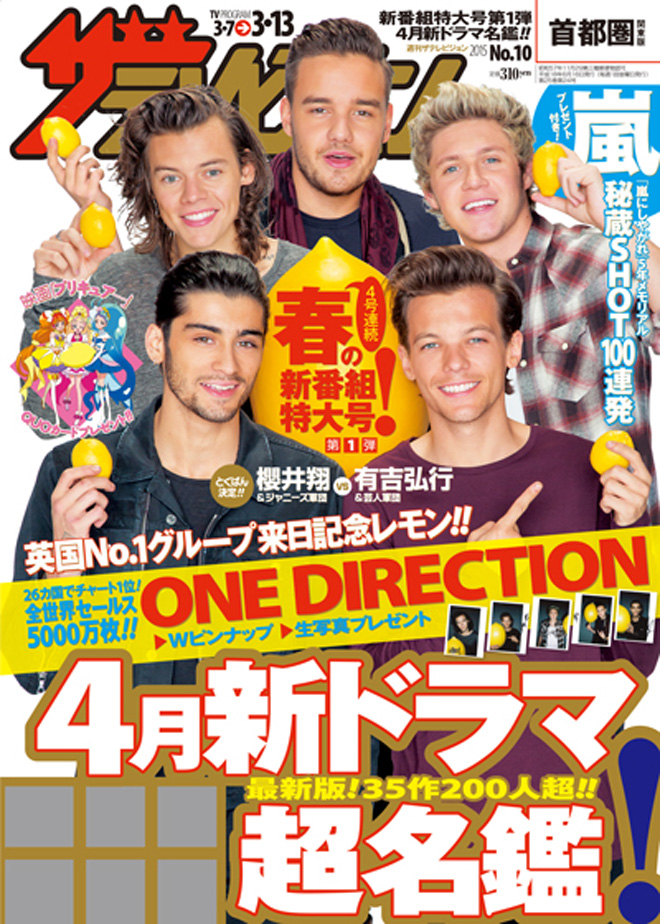 ワン・ダイレクションがTV情報誌『週刊ザテレビジョン』3月4日(水)発売号で表紙を飾っている。海外アーティストが単独でレモンを持って表紙に登場するのは、創刊33年の中で今回が初だそうだ。海外アーティスト単独表紙としては、28年前の1987年11月6日号でマイケル・ジャクソンが表紙を飾っているが、この時はレモンは持っていなかったとか。