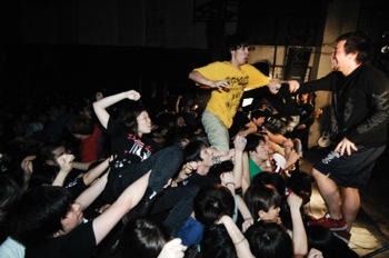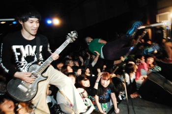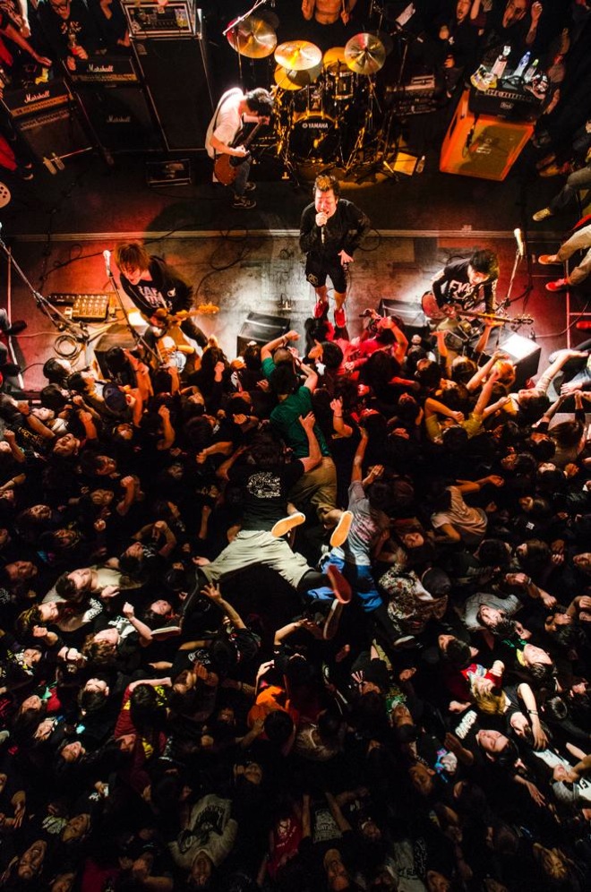 後半戦に入る前に、ぐしゃぐしゃになったフロアを見渡して、「凄くいい景色が見えてます。ツアーファイナルでいつもやっていた京都MUSE。ここでソールドアウトしたライブの景色が見たかった。その夢が今日叶いました。」と中途。「ここにいるみんなそれぞれの人生のちょっとした時間に俺らの音楽やライブが横にあって、寄り添ってくれてる人たちが今日こんなに集まってくれて嬉しいです。そんなみんなに“この両手で何が出来るかな”、そう思って書いた曲を」と「HANDS」を披露。その後、00年代メロディック・ハードコア最高峰のナンバー「You will be next」を投下すると柵なしのステージ前ではオーディエンスが次から次へと、ステージから客席へ飛び込み美しい放物線を描く。