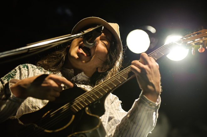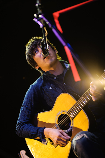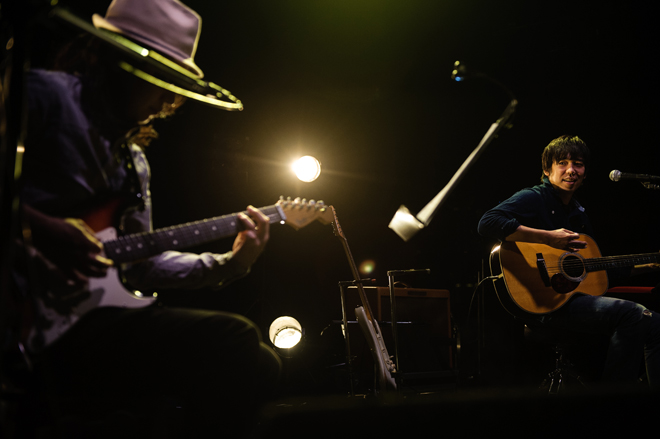 ここで着替えをすませた森が再びステージに登場。ついに2人がステージに揃った。いよいよ2人のセッション…とはならず、2人は楽しげに話し始める。初めて会ったときの話や、飲みに行ったときのことを喜々として語り合う。この日のライヴに向けて曲を決めるときにジョン・メイヤーの曲も候補に挙がったという話になると、森が即興で「Who Says」を弾き出し、すぐに大橋が合わせて即興のジャム・セッションとなり、突如2人のセッションがスタートした。まずは大橋が選んだという森の曲「白日」。この日は“2人だけでどこまでできるか”がテーマということで、バンドのサポートはなく、バックは2人のアコースティック・ギターだけ。2人はボーカル・パートを分け、サビでハモリながら歌いつづっていく。続いて、今度は森が選んだ大橋の曲「magic girl」へ。森がエレキ・ギターに持ち替えて、艶やかなサウンドで酔わせた。