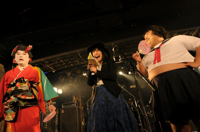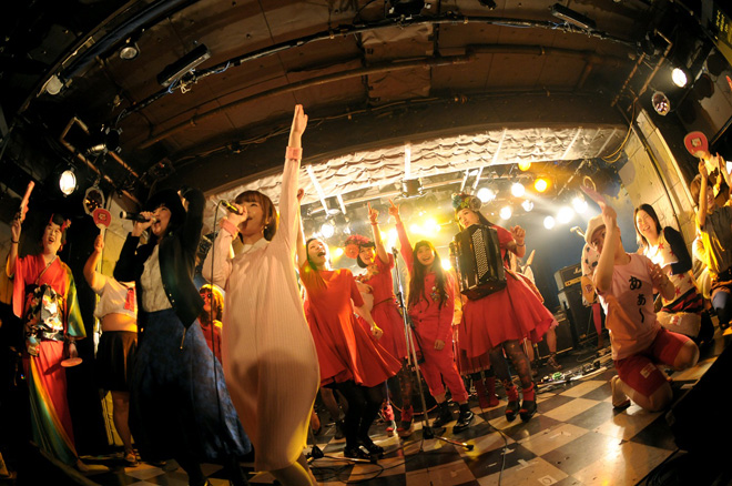 両組の演奏が終わり、来場者の投票の結果、僅差ながら見事勝利を勝ち取ったのは桃組。アンコールでは、桃組の呼び込みの下、紅組メンバー、お笑い芸人一同もステージに上がり、出演者全員で事務所の先輩・PUFFYの「アジアの純真」を合唱。歌合戦イベントでありばがら大団円にて幕を閉じた。