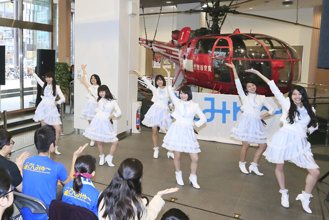 「明るく!元気に!爽やかに!私たち“防災アイドル”さんみゅ~です。」と敬礼をすると、博物館の入り口を埋め尽くした200人の観客から大きな拍手が沸き起こる。「曲も歌詞も、この曲はまさに消防博物館の為にある曲ですね」と、消防博物館長の挨拶に、リーダーの西園みすず(19)は「この曲は普段から防災の意識が高まるような歌詞になっていますので、覚えてほしいです」と、防災アイドルとしてアピールしてみせた。