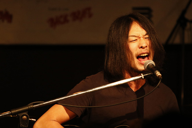 この日はBRAHMANとSiMの対バンという発表だったが、スタート時間にステージへ登場したのは、なんとHEY-SMITHのG、Vo猪狩秀平だった。宮古のオーディエンスは驚きつつも拍手で迎える。この日のBowlineに誘われたもののメンバーの脱退もあり、バンドでのライブができない状況にあったHEY-SMITHだが、BRAHMAN TOSHI-LOWからの電話がきっかけで、急遽ギター1本で弾き語りをすることになったのだという。