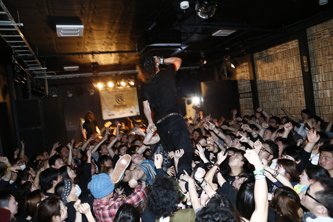 メンバー4人各々が放つ圧倒的な音と激情的なパフォーマンス、それに負けじとオーディエンスがダイヴやモッシュで暴れ返す様は、ライブハウスという濃密な場所でしか出せない熱を圧縮したような、渾然一体となった空気感を生み出した。MCなしの50分、怒涛のように過ぎ去った圧巻のステージが嵐のように過ぎ去っていった。