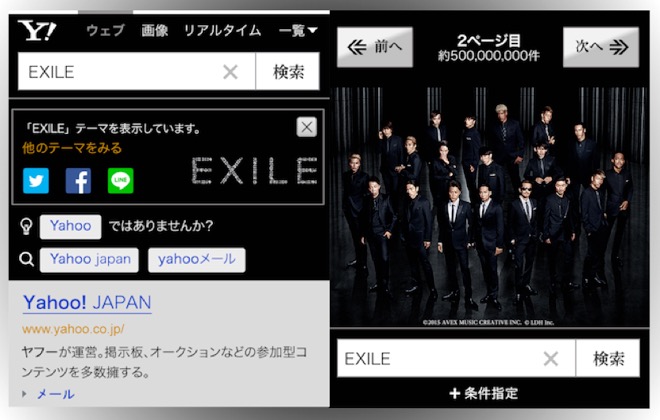 新生EXILEとして初のアルバム『19 -Road to AMAZING WORLD-』のリリースを記念して、EXILEの「Yahoo!検索きせかえテーマ」がスタートした。