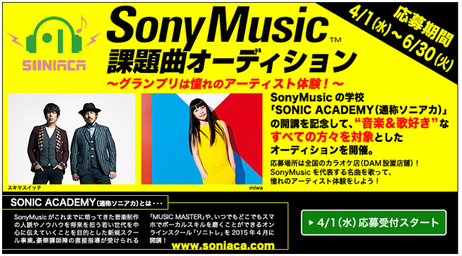 「SonyMusic課題曲オーディション」は、ソニーミュージックの音楽スクール“SONIC ACADEMY(通称ソニアカ)”の開講を記念して、第一興商の協力のもと開催。音楽&歌好きならだれでも参加OK。DAM★とも精密採点またはDAM★とも録音で85点以上ゲットすれば応募できる。応募資格はジャンル、年齢、国籍不問。何度でも応募できるので、納得いくまでトライしよう。