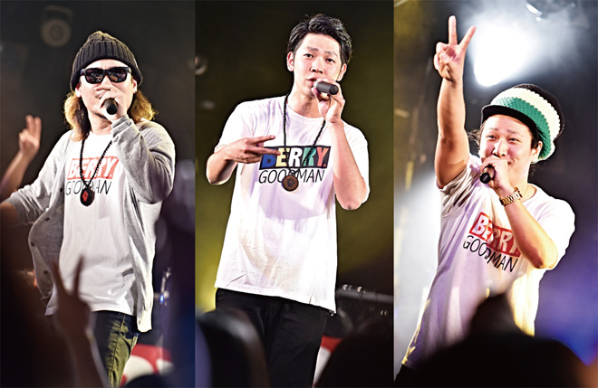 Softlyのパフォーマンスが終わると渋谷クアトロ会場後方に居た観客が一斉に前方に移動し、ざわつき始める。中学の同級生だったRoverとHiDEXに、MOCAが加わり2013年11月に大阪で結成された3MCグループ、ベリーグッドマンの登場だ。2014年にファースト・アルバムを出したばかりで、活動の中心は関西だが、東京にも大勢のファンが詰めかけている。