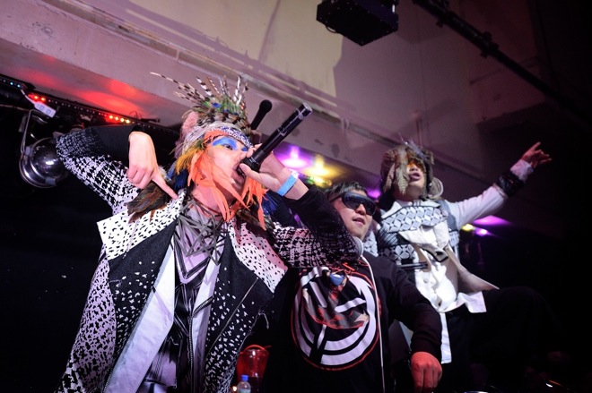 この日、同パーティーに登場したのはYAMAMURAとSAKAIの2名だ。m-floのメンバーであり、イベントのメインDJでもある☆Taku Takahashiのプレイ中に、YAMAMURAとSAKAIが登場するや大歓声が巻き起こり、奇抜で独創的な衣装を身にまとった2人のパフォーマンスが会場に鮮烈な印象を与えた。披露されたのは、4月8日リリースの1stアルバム『ELECTRONIC HUMANITY』収録音源をリミックスした「It’s Alright! (☆Taku Takahashi Remix)」。リミックスを手掛けたのはもちろん☆Taku Takahashiだ。