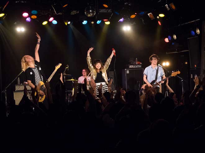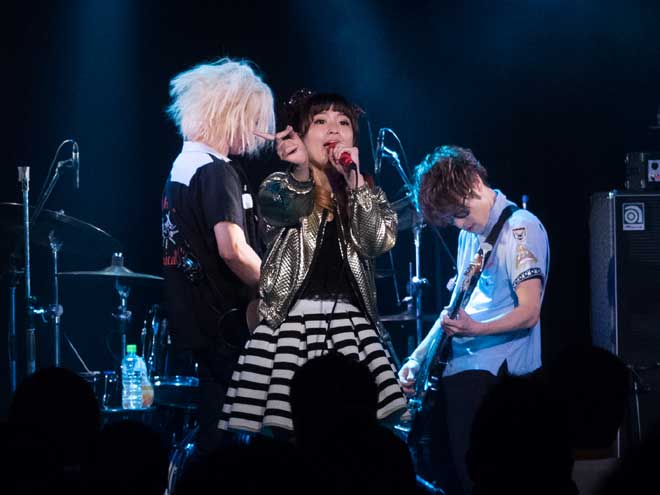 プールイ(Vo)、テンペスト竹内(G&Cho)、小原just begun(B&Cho)の3人にサポートドラマーを加えた4人編成で「リプミー」から勢いよくライブをスタート。海外からのゲスト(?)マリシア・キーズをむかえての「パンケーキ」、女性ダンサーを交えて「エビマヨ詐欺」を披露し、ライブのテンションはグングン上がる。