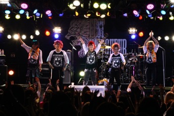 SEに乗せて、大歓声の中をメンバーが次々に登場するとライブは「NANIWA SAMBA」からスタートした。ライブの後半の盛り上げナンバーとして配置されることが多い同曲によるオープニングに、満員のオーディエンスの興奮度が一気に高まった。その興奮を一層高めるがごとく立て続けに「ヴァレンシアとヴァージニア」をフロアに叩きつける。HALの伸びやかなヴォーカルに乗り、GAKUとI’LLの超高速ツインリードギターソロも序盤から炸裂。そのテクニックには目を見張るばかりである。