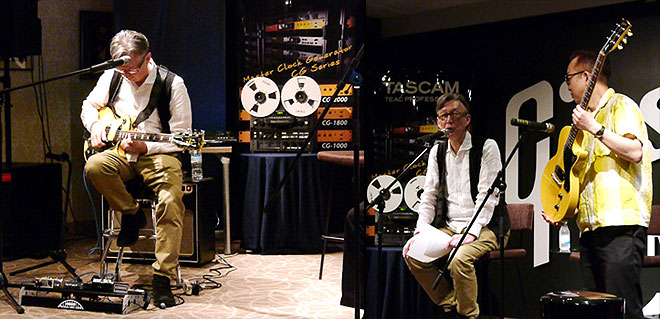 ▲会場となるGibson Brands Showroom TOKYOは、GibsonのギターやTASCAMのレコーディング機材が数多く展示されるスペース。ステージ横にも多くのギターが並べられ、イベントの雰囲気はバッチリ。