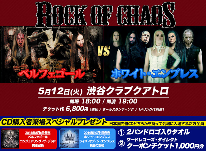 5月12日(火)渋谷クラブクアトロで、ベルフェゴールとのジョイント公演<ロック・オブ・ケイオス>、5月14日(木)には原宿アストロホールでホワイト・エンプレスの単独公演が行われる。元クレイドル・オブ・フィルスのポール・アレンダー(G)と元ルナ・モーティスの女性ヴォーカリスト、メアリ・ズィマーを中心としたこのバンドは、デビュー・アルバム『純白の女帝』がセンセーションを呼び、来日が熱望され初の日本上陸を果たすことになった。