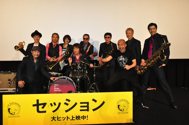 鬼教官とドラマーを目指す青年の凄まじいまでの鍛錬の日々を濃密に描いた映画『セッション』が公開中されているが、4月21日(火)、本作を鑑賞し「釘付けになった」と語る竹中直人と、東京スカパラダイスオーケストラの夢のスペシャル・セッションが実現した。TOHOシネマズ新宿での上映前に、生で演奏するスカパラに対し、竹中直人が劇中のシーンを再現する形で“鬼教官”フレッチャーに扮し、厳しく指導するというパフォーマンスで会場は笑いと歓声に包まれた。