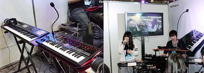 ▲こちらは「“超”Rolandシンセサイザーブース」。アナログ/デジタルシンセ音源搭載の触って楽しい最新シンセサイザー「JD-Xi」「JD-XA」を中心に展示をしたローランドのブース。デモではニコニコ動画で人気を集めるバンドHoneyWorksのピアノ・キーボード担当の宇都圭輝さんと歌い手さんがコラボ。ミュージックワークステーション「FA-08」で、バンド編成の曲をリアルタイムレコーディング。ドラム、ベース、鍵盤、ギターなどのパートを次々と重ね、最後にはボーカルとともにライブ。「JD-Xi」のボコーダーやトリッキーなサウンドも交えた演奏には、ブースを囲む人垣からは大きな拍手が。