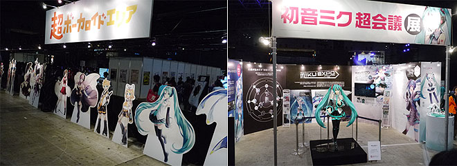▲ボーカロイドの人気キャラクターのパネルが来場者を迎える「超ボーカロイドエリア」(左)。パネルの上の天井には特殊な音響特性を持つヤマハのTLFスピーカーが組み込まれていた。クリプトン・フューチャー・メディアは、「初音ミク 超会議展」と題して、世界への創作の広がりを紹介。等身大フィギュアの展示や海外イベントの映像を公開(右)。