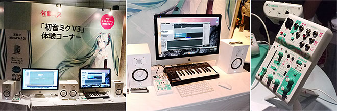 ▲クリプトン・フューチャー・メディアはボーカロイドの体験コーナーも展開。これからボーカロイドを始めたいという人にはうれしい展示内容。話題の初音ミクデザインのミキサー「AG03-MIKU」も触れるようになっていた(右)。