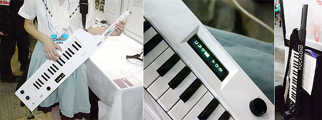 ボーカロイド関連では、ヤマハのVOCALOIDを演奏できるキーボード「VOCALOID Keyboard」が超まるなげひろばニコニコ学会βシンポジウムのエリアで展示されていた。「VOCALOID Keyboard」はこれまで多くのイベントで展示されてきたが、歌詞を同時に入力する必要があるなど、演奏は非常に難しかった。しかし、最新バージョンでは、歌詞はあらかじめiPhoneから無線で送り込み、鍵盤では音階のみを演奏するという仕様に変更。演奏の難易度は格段に下がっている。形状も一般的なキーボードタイプからショルダーキーボード(ショルキー)タイプに変更。左手部分にはピッチベンド(ギターでいうチョーキング)用のリボンコントローラーや、発音させる歌詞を前後させるスイッチが、鍵盤側にはボリュームや各種パラメーターを調整するためのノブが用意されている。内蔵チップはポケット・ミクなどに使われているNSX-1よりもかなり進化したもので、処理速度や表現力は大幅に向上しているという。
