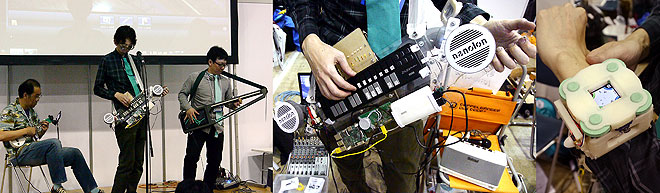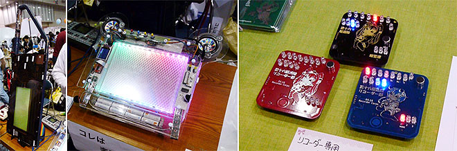 ▲エリア内にはライブが行われるステージも。写真左はボーカロイド音源LSI内蔵の製品(eVY1シールド/モジュール、ポケット・ミクなど)を使用した自作楽器による演奏。写真中は同ライブ出演者によるポケット・ミクを分解して使用した歌う楽器ショルキーボカロン。スピーカーやリアルタイムに歌詞入力を行う機能も搭載。腕時計タイプのワイヤレスMIDIコントローラーも(右)。