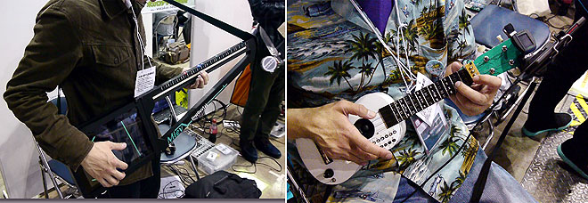 ▲eVY1チップや各種センサーを組み込んだ、ニコニコ動画でおなじみの「あの楽器」っぽい歌う楽器(左)。触るとグラフィックが表示されるタッチパネルで演奏する。写真右はピックアップ+スピーカー内蔵ウクレレにさらにeVY1を組み込み、指板上のスイッチでボーカロイドに歌わせることもできるハイブリッドなウクレレ。
