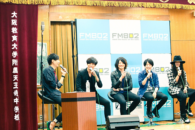 [Alexandros]をゲストに迎え公開収録が行なわれたのは4月30日のこと。当日小講堂に集まった生徒たちに黄色い歓声で迎えられたメンバーは、学生たちにもらった質問に答えて、高校時代のエピソードを話したり、高音をきれいに歌うコツを伝授したりと交流の場を盛り上げた。この公開収録の模様は5月4日のFM802『ROCK KIDS 802 -OCHIKEN Goes ON!!-』番組内で一部オンエアされる。