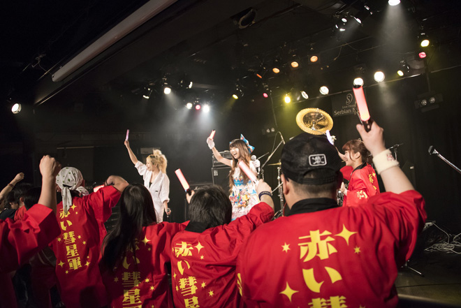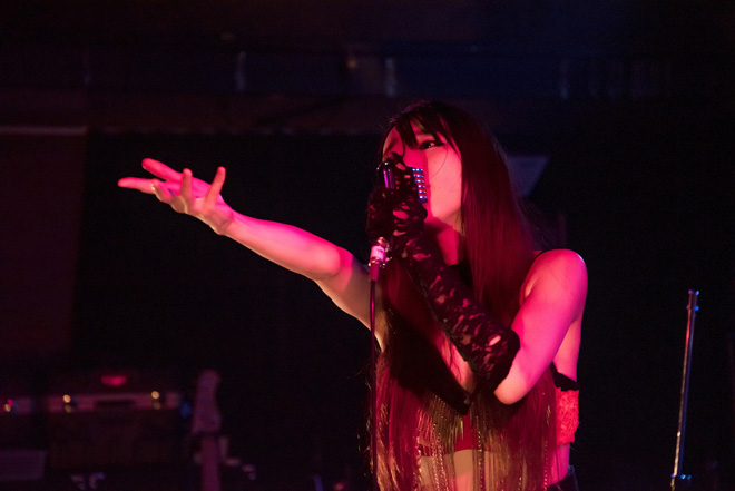 中盤から終盤にかけて、迫力あるハードな楽曲とファンシーなポップな楽曲を繰り出しながら、バンドが奏でるグルーヴがオーディエンスの熱気をも包み込んでいく。ライブ空間に身を委ねる逢瀬アキラの真骨頂だ。あっという間に時は過ぎ、次が最後の曲というところでファンに向かって、アキラはシングル「Dancing 13th Baby」を書くきっかけとなった父親との仲を話しはじめた。この曲は13歳の時の自分への応援曲とのことで、話が父親への感謝に及んだところで、まさかの父親登場に「どうした、オヤジ!」とサプライズに驚きを隠せない様子だった。父親から花束を渡され会場からはあたたかい拍手が沸き起こる。
