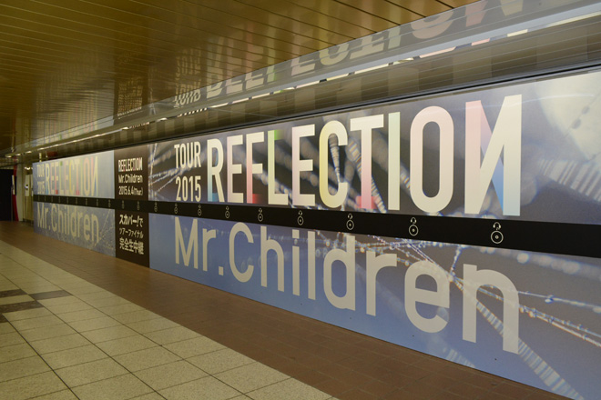このイベントは、<Mr.Children TOUR 2015 REFLECTION>ツアーファイナルの生中継を記念して実施されたスカパー!によるイベントで、一切の事前告知が行わずに設置されたものだ。東京メトロ丸ノ内線新宿駅メトロプロムナードにある新宿メトロスーパープレミアムセットの壁面に20個のイヤホンジャックが用意され、歩行者が手持ちのイヤホンやヘッドフォンをつなげると、『REFLECTION』から先行試聴できるというもので、運よく遭遇できたミスチルファンには歓喜のサプライズとなった。このイヤホンジャックイベントは今後も、予告無しで全国の主要都市にて実施される予定だとか。