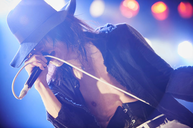 ガラの“暴れちゃいますか”の言葉をキッカケに「オリエンタルBLサーカス」がスタート。結生のオリエンタルなギターリフに続くネロのスネア連打がキネマ倶楽部の高い天井までの広い空間を埋め尽くす。“踊りだせ手を繋ぎ”とミドルのハーフテンポに落ちるパートでは真紅のライトに包まれてガラがゆっくり言葉を噛みしめるように歌う。そして“さあ踊れ”という言葉を合図にまた、激しい道化師の世界へ逆戻り。このジェットコースターに乗っているような展開がスリリングで心地よい。