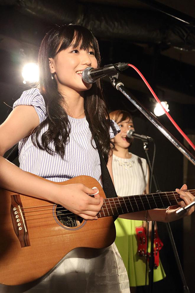 さらに、ひとりずつのソロコーナーでは、田崎あさひがピアノからアコギへと持ち替えて荒井由実の「ルージュの伝言」を弾き語り。そしてそのまま<I wanna spend more time to be with you. I’m gonna see you soon ’cause I love you>と、カントリー・ガールズ「愛おしくってごめんね」のフレーズへと展開していく。ところがここで、歌詞を間違えてしまう田崎あさひ。そして「歌詞間違っちゃったみたい。ごめんなさいね♪」と、島村嬉唄ちゃんバリの“ごめんねポーズ”をキメると、会場の至るところから「可愛い!」という、本来なら心の中でつぶやかれるはずの声が、つい漏れていた。