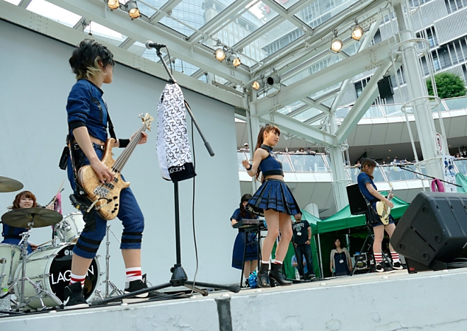 今回、初のリリースイベント開催となったLAGOONを一目見ようとステージ前にはイベント開始前からたくさんの観客が集まった。開始時間になると、メンバーのMIORIがデニムとレザー生地のミニスカートに大胆なへそ出しファッションでステージへ登場。続いてRINO、NANA.、YUKINO、yuriも登場し、観客から早くも熱い声援が送られる。