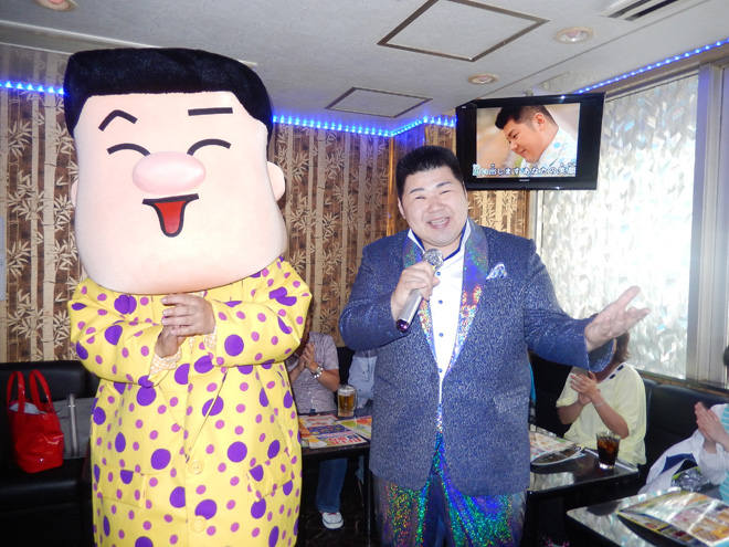 このイベントは、約50数年前に大江の師匠である北島三郎が、デビュー前に渋谷の飲み屋街をギター1本で弾き語り修行を積んでいたという伝説にあやかる形で開催されたもの。大江は、同店でカラオケを楽しんでいる団体客の部屋に突撃訪問してその場でリクエストに応え、北島三郎の「まつり」など4曲をゆるキャラの“のろまクン”と一緒に熱唱し盛り上げた。