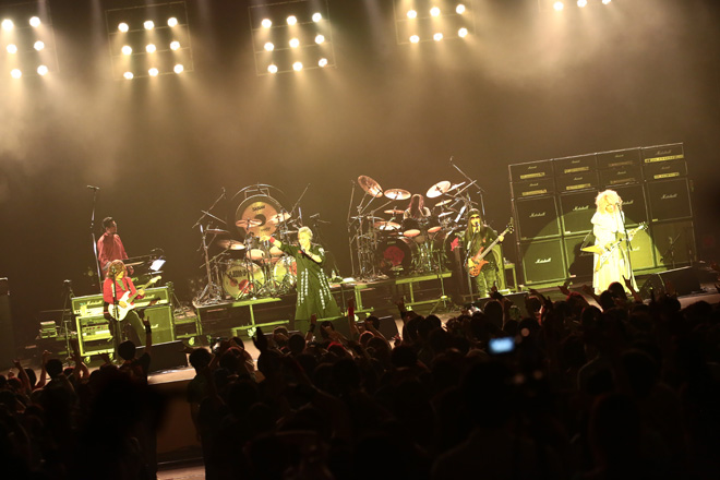 筋肉少女帯の華麗にしてハードな余韻が残るなか、オーディエンスは筋肉少女帯人間椅子の登場を今か今かと待ちわびる。ここからが本番だ。橘高文彦がヴォーカル、内田雄一郎がギターを務める“ブラック菩薩”に人間椅子の3人が加わる編成でBLACK SABBATHの「IRON MAN」、人間椅子に大槻ケンヂが加わって「日本の米」、さらに本城聡章を加えての「君は千手観音」など、この夜にしか味わえない特別な趣向を目の当たりにした客席からは大歓声が飛んでいた。KISSの「DETROIT ROCK CITY」を奏でる直前にジーン・シモンズばりに血糊を垂らすダブル・ベーシスト、鈴木研一と内田雄一郎の姿を見て、大人の本気の遊び心に胸を熱くした者は多かったにちがいない。祝祭感たっぷりのさまざまな編成が、おおいに観客を沸かせていた。
